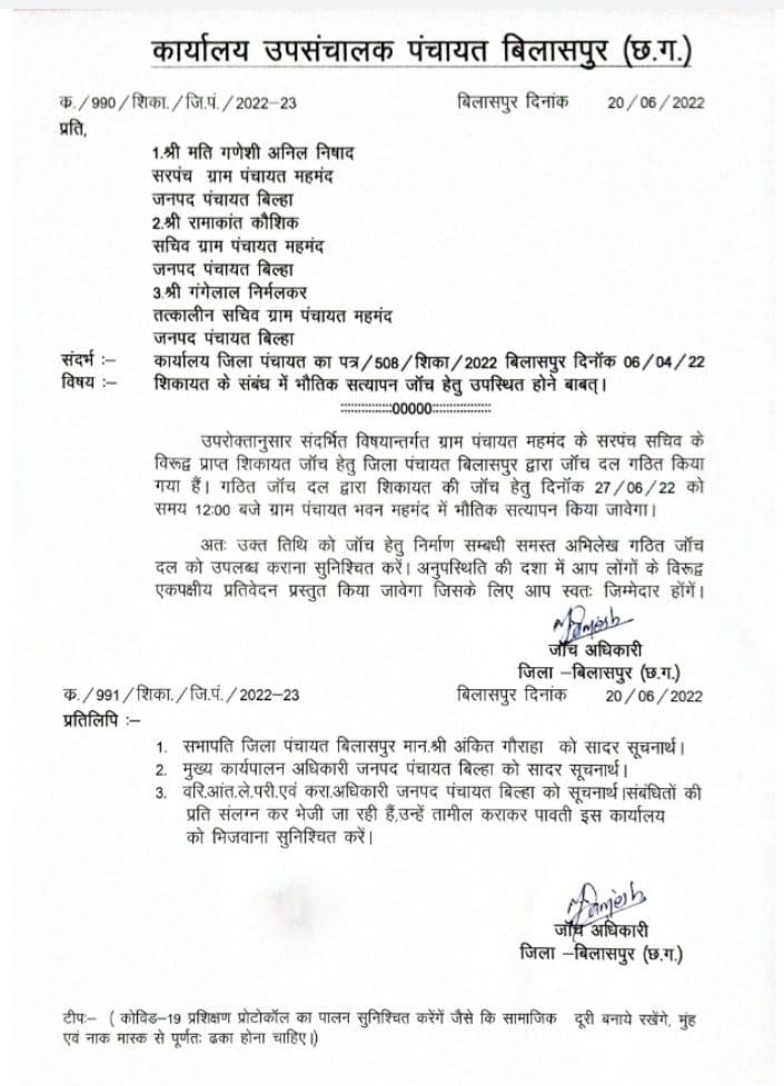 वर्तमान सरपंच गणेशी अनिल निषाद और सचिव रमाकांत कौशिक को भी तलब किया। पत्र में बताया गया कि सभी लोग 27 जून को ग्राम पंचायत महमंद पहुंचे। टीम को भौतिक सत्यापन में सहयोग करें।