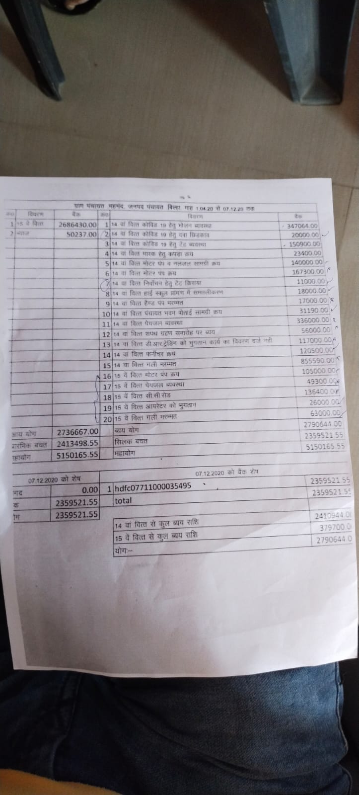 जनपद पंचायत से हासिल दस्तावेज के अनुसार पेयजल व्यवस्था पर 3,36,000 और डीआर ट्रेडिंग पर 1,17,000 खर्च हुआ है। शपथ ग्रहण समारोह पर 56 हजार खर्च आया है। सचिव ने 5,55,,590 रूपया गली मरम्मत में खर्च होना बताया है। दुबारा मोटर पम्प क्रय में 1,05,000, पेयजल व्यवस्था पर 49,300 की जानकारी है। सीसी रोड निर्माण पर 1,36,400, आपरेटर भुगतान 26000 और दुबारा गली मरम्मत पर 63000 रूपयों का खर्च होना बताया गया है।