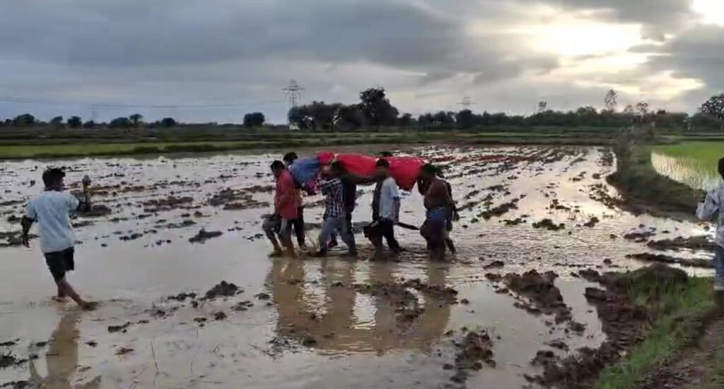 जाँजगीर-चाँपा : जिले के दल्हा पोडी गाँव में 28 जुलाई को एक ग्रामीण की मौत हो गई। उनके अंतिम संस्कार के लिए शव को कंधों पर लादकर मुक्तिधाम ले जाया गया। खेतों में कीचड़ को पार करके ग्रामीणों ने अपने प्रियजन का अंतिम संस्कार किया।