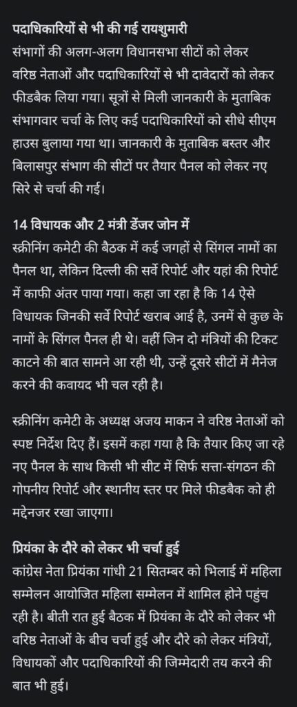 - कांग्रेस प्रत्याशियों को लेकर ने सिरे से बनाया गया पैनल : छत्तीसगढ़ के 14विधायकों और दो मंत्रियों की...