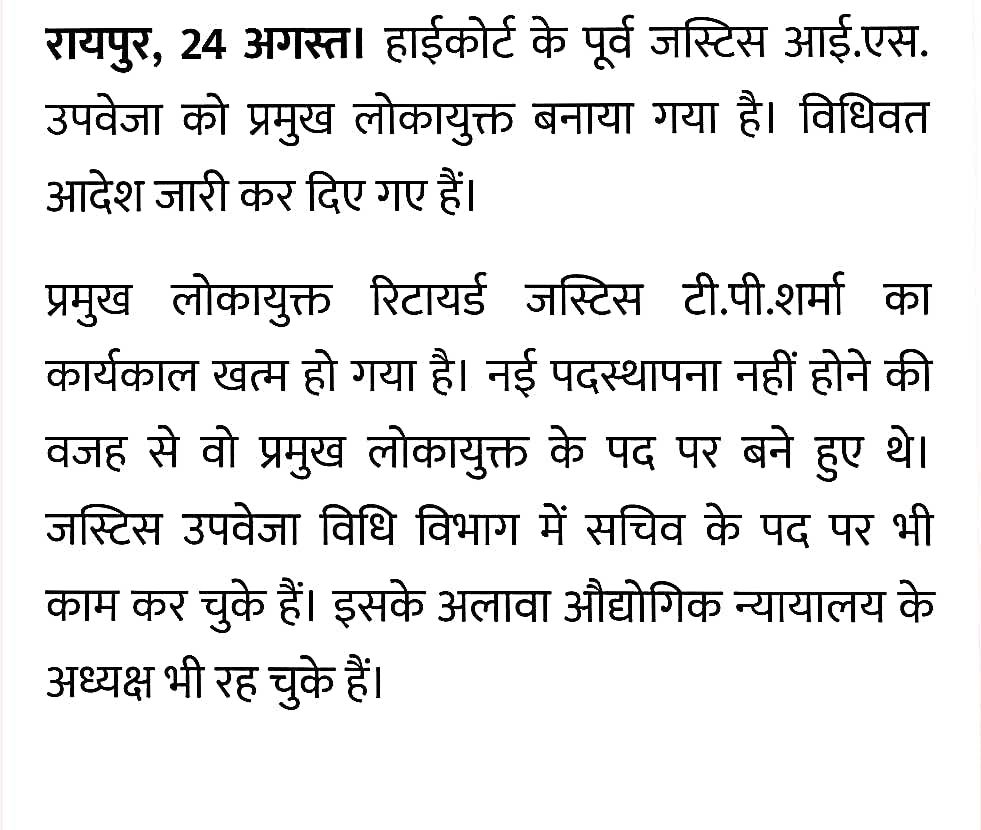 - रिटायर्ड जस्टिस उपवेजा को छत्तीसगढ़ का लोकायुक्त प्रमुख बनाया गया, जस्टिस टी पी शर्मा की जगह लेंगे