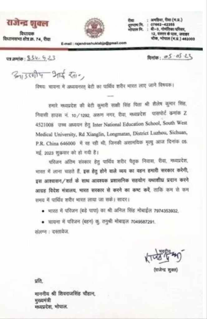 मध्यप्रदेश के रीवा की बेटी की चाइना में मौत, पार्थिव शरीर भारत लाने विदेश मंत्रालय से गुहार, स्थानीय विधायक ने लिखा विदेश मंत्री को पत्र किय मुख्यमंत्री शिवराज सिंह से बात