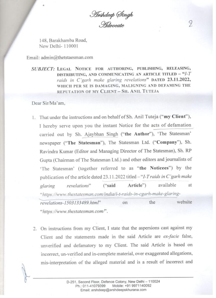 जानकारी के मुताबिक टुटेजा साहब ने एक अंग्रेजी अख़बार के वरिष्ठ पत्रकार अजय भानसिंह और न्यूज़ टुडे के संपादक सुनील नामदेव को भी नोटिस भेजा था।इसी तरह से जगत विजन पत्रिका के संपादक विजिया पाठक और छत्तीसगढ़ ब्यूरो चीफ मनीशंकर पान्डेय को भी नोटिस भेज चुके हैं। इस नोटिस के तथ्यों और टुटेजा साहब की कार्यप्रणाली से खड़े हुए भ्रष्टाचार के पहाड़ का आपस में गहरा रिश्ता है। उनकी मानहानि वाले तथ्य अदालत की कार्यवाही में गंभीर आपराधिक आचरणों के दायरे में है।
