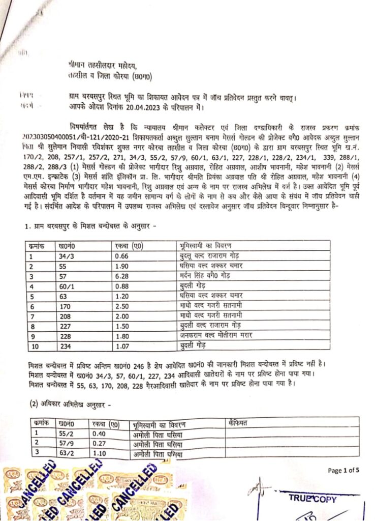 इनके द्वारा सुनियोजित तरीके से ग्राम बरबसपुर स्थित भूमि ख.नं. 170/2, 208, 257/1, 257/2, 271, 34/3, 55/2, 57/9, 60/1, 63/1, 227, 228/1, 228/2, 234/1, 339, 288/1, 288 / 2,288 / 3 ( 1 ) लग भग 25 एकड़ जमीन मेसर्स गोल्डन की प्रोजेक्ट भागीदार रिशु अग्रवाल, रोहित अग्रवाल, आशीष भावनानी, महेश भावनानी (2) मेसर्स एम.एम. इन्फ्राटेक ( 3 ) मेसर्स शांति इंजिकॉन प्रा. लि. भागीदार श्रीमति प्रियंका अग्रवाल पति श्री रोहित अग्रवाल, महेश भावनानी (4) मेसर्स कोरबा निर्माण भागीदार महेश भावनानी, रिशु अग्रवाल एवं अन्य के नाम पर राजस्व अभिलेख में दर्ज कराई गई है। उक्त आवेदित भूमि पूर्व आदिवासी भूमि दर्शित है वर्तमान में यह जमीन सामान्य वर्ग के लोगों के नाम से कब और कैसे आया, यह सूक्ष्म जांच का विषय है। लगभग 25 एकड़ जमीन की खरीदी मंत्री जयसिंह अग्रवाल के पुत्र रोहित अग्रवाल व परिवार के अन्य सदस्यों व पार्टनर के नाम पर लिया गया है।
