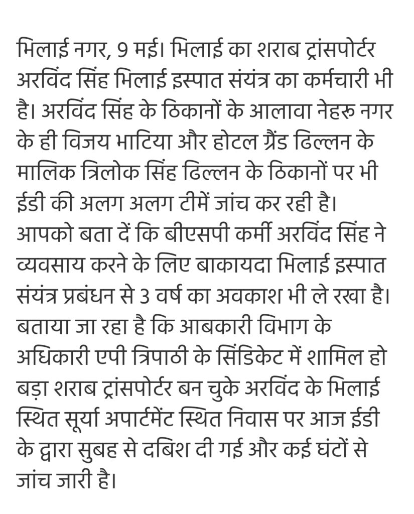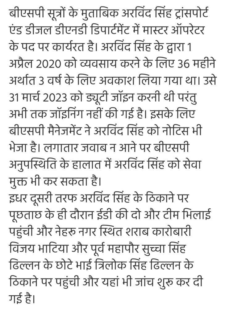 - भिलाई में जिस शराब ट्रांसपोर्टर अरविंद सिंह को ईडी खंगाल रही थी वह बीएसपी कर्मचारी भी है, पूर्व महाप...