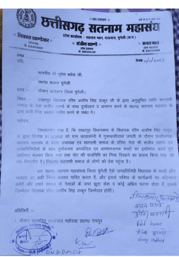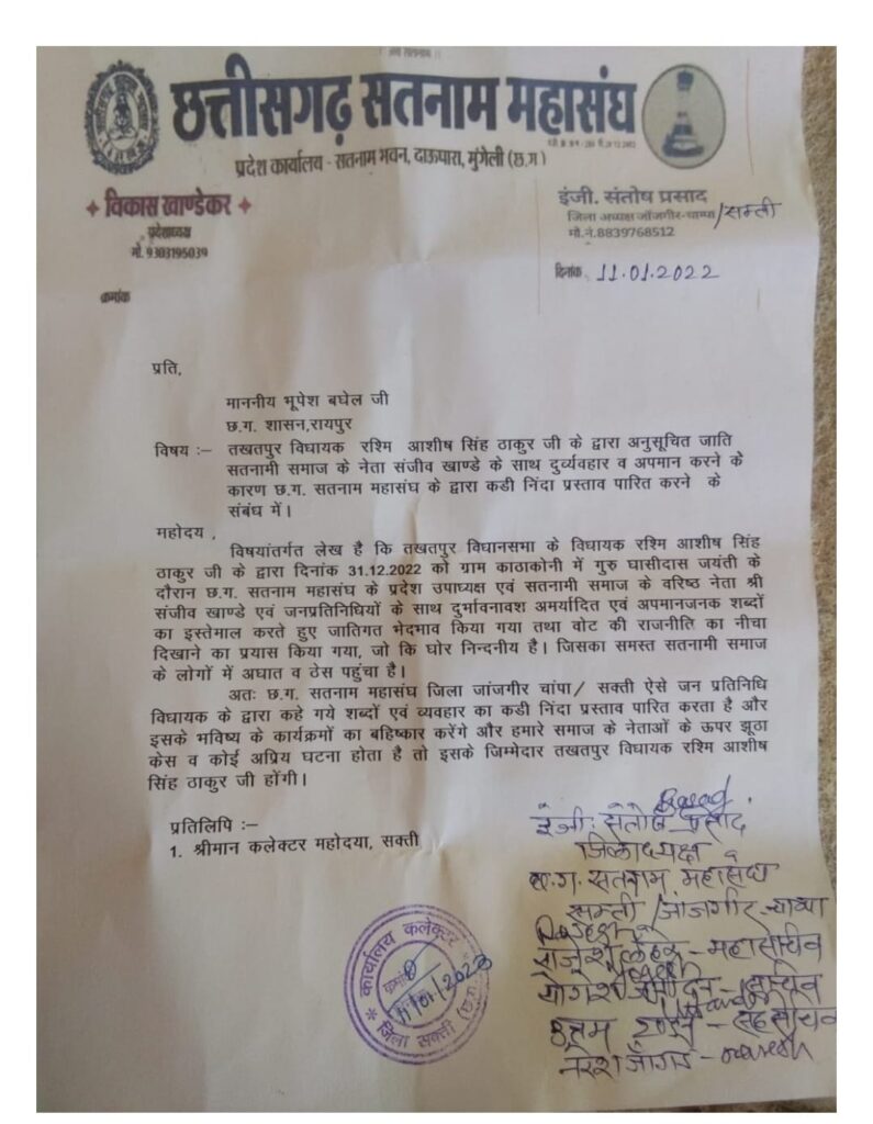 छत्तीसगढ़ सतनाम महासंघ के बिलासपुर जिलाध्यक्ष व कांग्रेस के जिला सचिव- बिहारी सिंह टोडर ने कहा कि मुख्यमंत्री माननीय भूपेश बघेल जी से तखतपुर विधानसभा के खपरी रेस्ट हाउस में सामाजिक नेताओ की मिलने की कार्यक्रम में अनुसूचित जाति (सतनामी) समाज की नेताओ को मिलने की अनुमति संसदीय सचिव रश्मि आशीष सिंह के कहने पर अधिकारियो द्वारा नही दिया गया। जबकि एडिशनल एस.पी.बिलासपुर (ग्रामीण) एस.डी.एम-तखतपुर, एस.डी.ओ.पी.कोटा तखतपुर, टी.आई.कोटा, की उपस्थिति में एस. डी.एम.कार्यालय तखतपुर में सामाजिक नेताओ के साथ 17 जनवरी शाम 4 बजे एक घंटे तक आवश्यक बैठक हुई थी। जिसमे निर्णय लिया गया था, की आप लोगो के एक प्रतिनिधि मंडल को अलग से मुख्यमंत्री जी से मुलाकात कराई जाएगी,एप्रूवल लिया जा रहा है ।