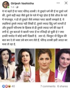 वरिष्ठ पत्रकार ने इन महिला एंकर्स के बारे में धीरेंद्र शास्त्री से पूछा- “ये देखने में माँ-बहनें लगती हैं या खाली प्लॉट?” वरिष्ठ पत्रकार गिरिजेश वशिष्ठ ने एक एफबी पोस्ट के ज़रिए धीरेंद्र शास्त्री से कुछ सवाल पूछा है… क़ायदे से तो ये सवाल इन महिला एंकर्स को ख़ुद करना चाहिए… लेकिन आजकल सरकारों और […]
