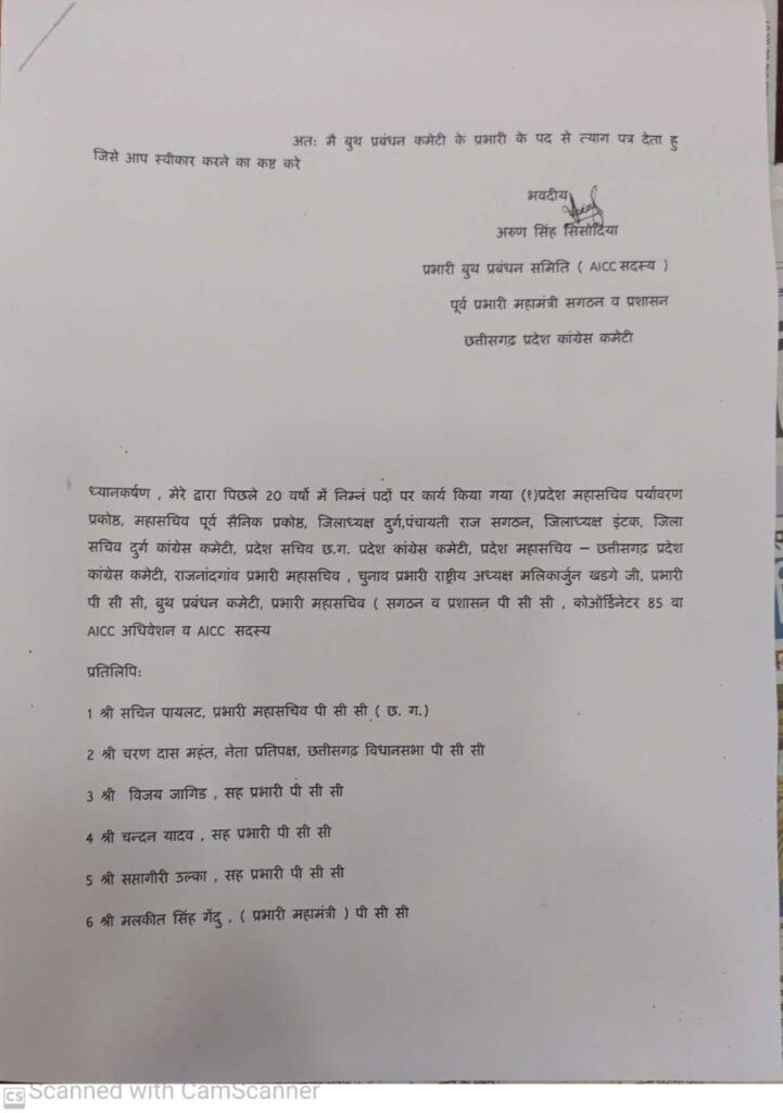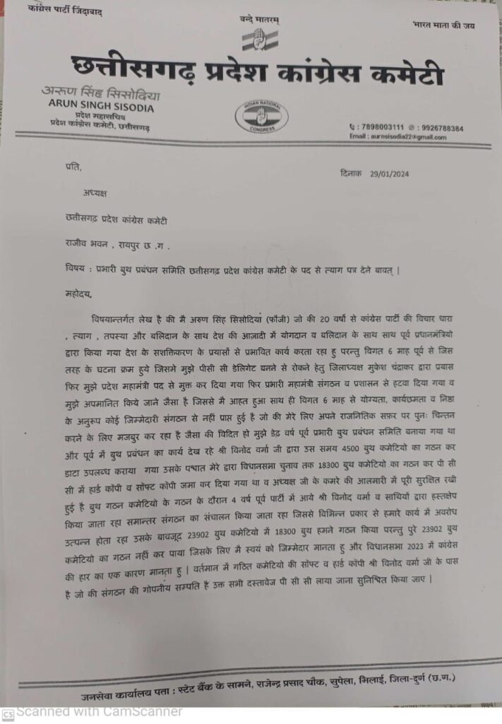 बताते हैं कि जब घोटाला उजागर हुआ तो हार का ठीकरा कांग्रेस पर ऐसा फूटा की अबकी बार 75 पार का नारा लगाने वाली पार्टी सत्ता से ही हाथ धो बैठी । छत्तीसगढ़ में पराजय का दंश झेल रही कांग्रेस में अब इस्तीफे का सिलसिला शुरू हो गया है। प्रदेश कांग्रेस महामंत्री अरुण सिंह सिसोदिया ने अपने पद से कारण सहित इस्तीफा दे दिया है। उन्होंने हार की समीक्षा ना किए जाने पर नाराजगी जाहिर करते हुए पार्टी आलाकमान को एक पत्र भी लिखा है। इस पत्र में तत्कालीन मुख्यमंत्री भूपेश बघेल के करीबी रिश्तेदार और छत्तीसगढ़ शासन के सलाहकार विनोद वर्मा के कारनामों पर उंगलियां उठाई गई है कांग्रेस पार्टी के विभिन्न पदों पर रहे सिसोदिया के इस्तीफे से भूपेश गिरोह हैरत में बताया जाता है । उधर ईडी ने महादेव एप घोटाले की जांच में तेजी लाते हुए ठोस सबूतों के आधार पर दर्जनों आरोपियों पर अपना शिकंजा कसना शुरू कर दिया है । इसके तहत कुछ आरोपियों के खिलाफ नए सिरे से कानूनी कार्यवाही किए जाने की खबरें आ रही है।