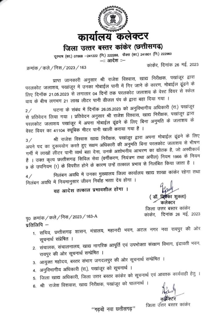 पानी निकालने से बड़ी बात डेढ़ लाख रुपये के मोबाइल का होना है। कांकेर की कलेक्टर डॉ प्रियंका शुक्ला के पास भी इतना महंगा मोबाइल नही होगा। प्रश्न ये भी उठ रहा है कि क्या प्रदेश में हुए 254 करोड़ रुपये के चाँवल बचत घोटाले से इस घटना का कोई लेना देना है?