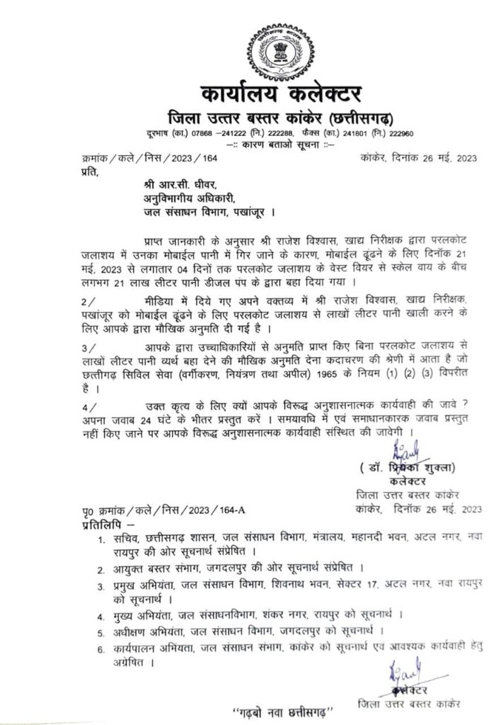 नोटिस में उल्लेख किया गया है कि खाद्य निरीक्षक पखांजूर श्री राजेश विश्वास ने मीडिया में दिए गए अपने वक्तव्य में कहा है कि उन्हें मोबाइल ढूंढने के लिए परलकोट जलाशय से लाखों लीटर पानी खाली करने के लिए आपके द्वारा मौखिक अनुमति दी गई है। उच्चाधिकारियों से अनुमति प्राप्त किए बिना परलकोट जलाशय से लाखों लीटर पानी व्यर्थ बहा देने की मौखिक अनुमति देना कदाचरण की श्रेणी में आता है जो छत्तीसगढ सिविल सेवा (वर्गीकरण, नियंत्रण तथा अपील) नियम 1965 के प्रावधानों के विपरीत है। उक्त कृत्य के लिए क्यों न आपके विरूद्ध अनुशासनात्मक कार्यवाही की जाए। समयावधि में एवं समाधानकारक जवाब प्रस्तुत नहीं किए जाने पर अनुविभागीय अधिकारी के विरूद्ध अनुशासनात्मक कार्यवाही संस्थित की जाएगी